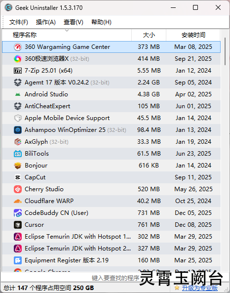 2、界面简单,使用方便。这个软件只有一个主界面。windows中所有已安装的软件会全部显示在这里,而所有和卸载有关的功能都集中在右键菜单中。
