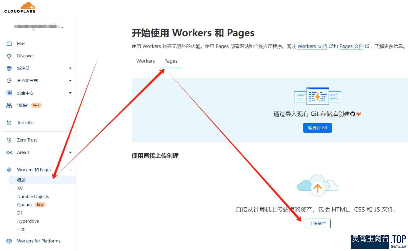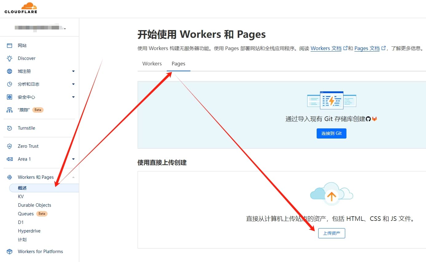 然后点击Workers和Pages页面的Pages,再点击下面的上传资产