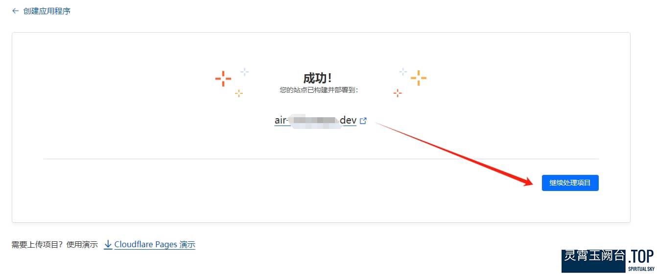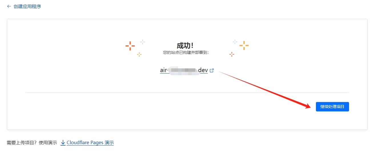 部署以后会显示一个域名,这个域名后面会用到,然后点击继续处理项目