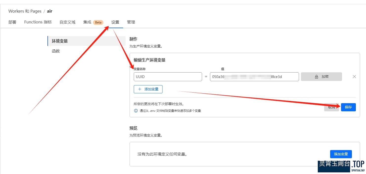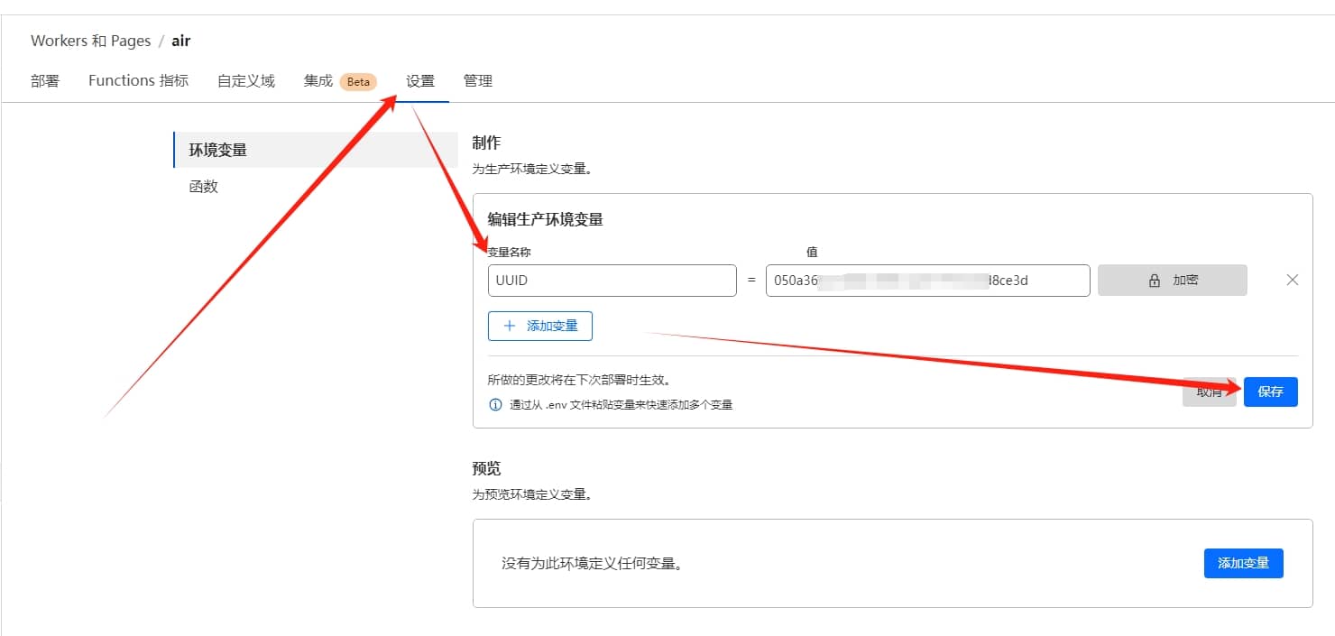 接着我们再去点击设置,然后设置环境变量,新建一个名字叫UUID的环境变量,后面的值输入一个UUID,你可以自己生成或者直接复制上面我提供的,然后点击保存