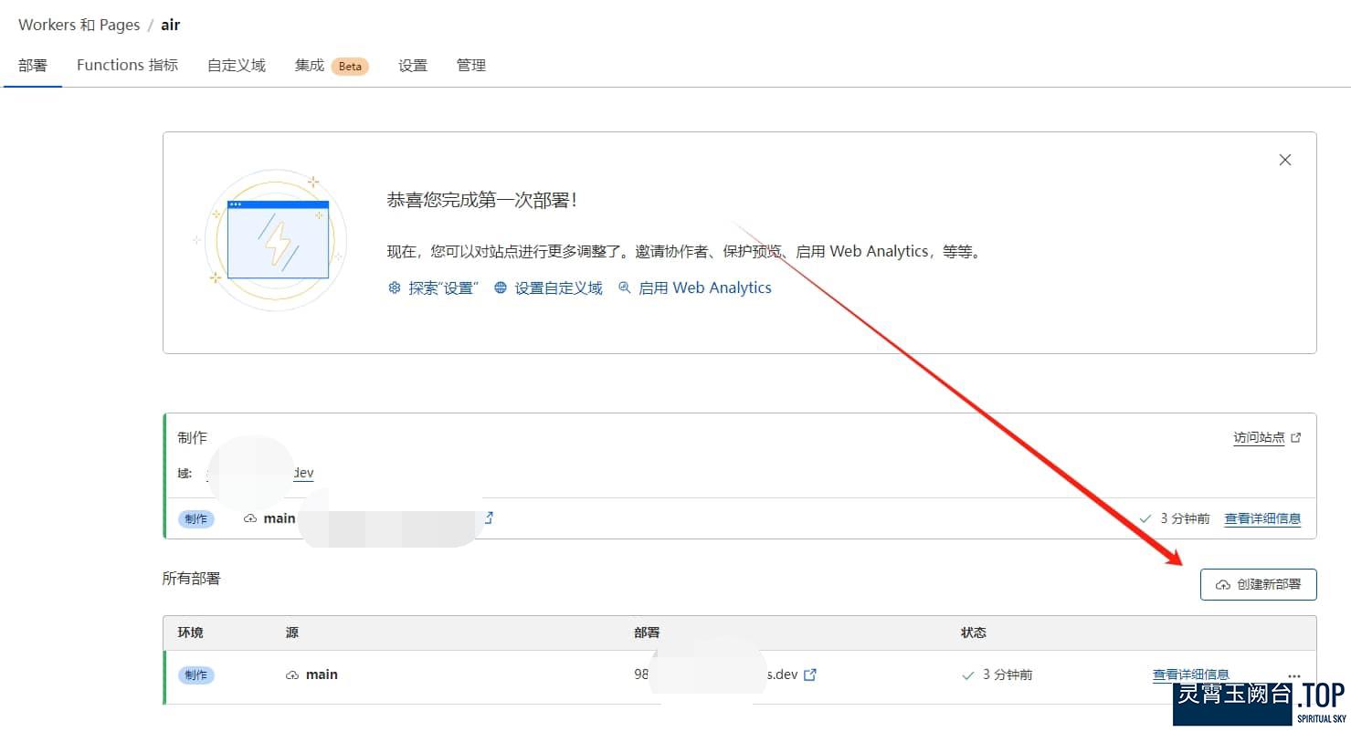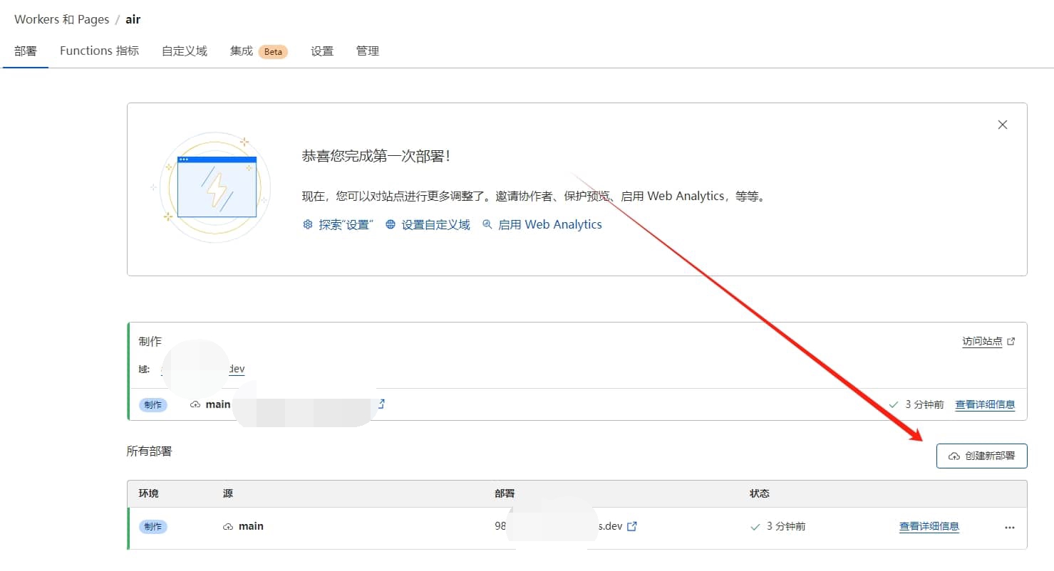 随后,我们需要切换到部署页面,然后再次进行部署,点击下面图中的创建新部署,然后选择之前下面的worker.zip文件