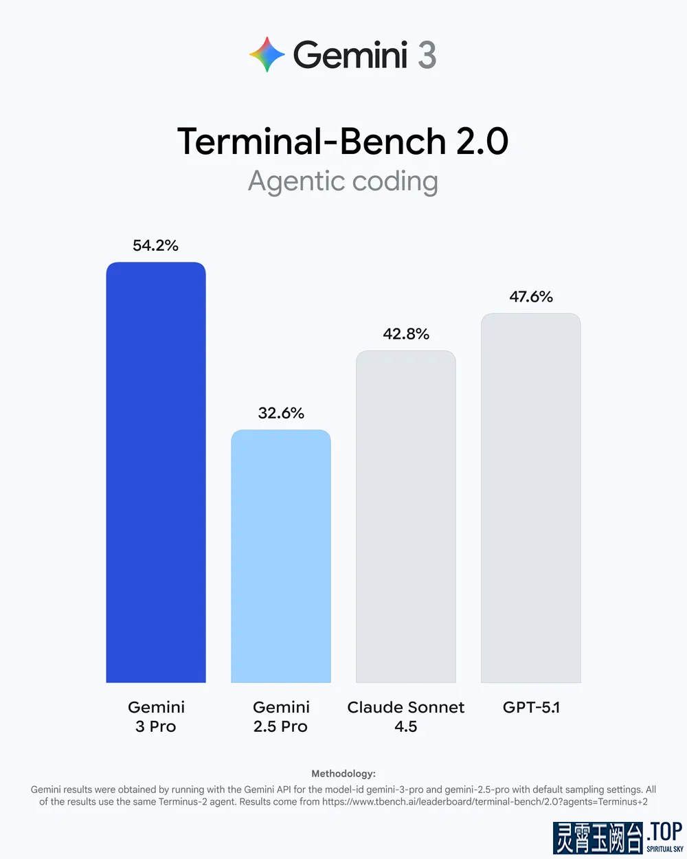 Terminal-Bench 2.0(Unix 环境指令执行 & 自动修复)中,Gemini 3 Pro 得分为 54.2%,明显高于 GPT-5.1 的 47.6%、Claude 4.5 的 42.8%,以及 Gemini 2.5 Pro 的 32.6%。