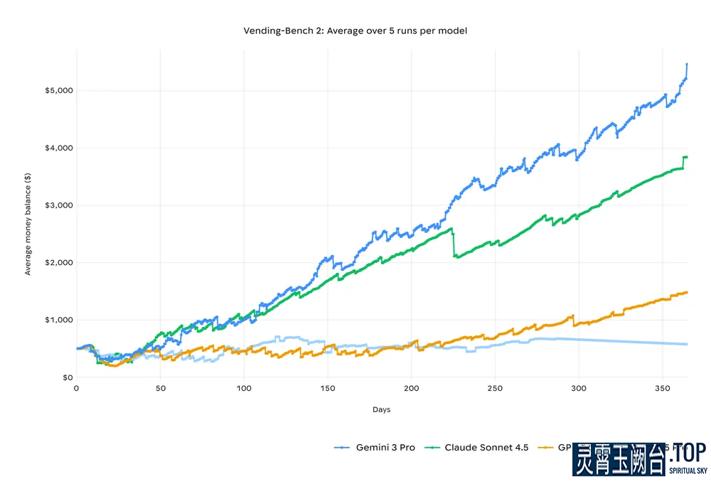 Vending-Bench 2(长期任务规划,越高越好),Gemini 3 Pro 得分 3,838,大幅领先 GPT-5.1 的 573。Gemini 3 Pro 的表现可以说是“代际级领先”。在长任务执行、自动化工作流、任务可靠性上,它不仅进入第一梯队,甚至与竞品拉开了非常明显的差距。
