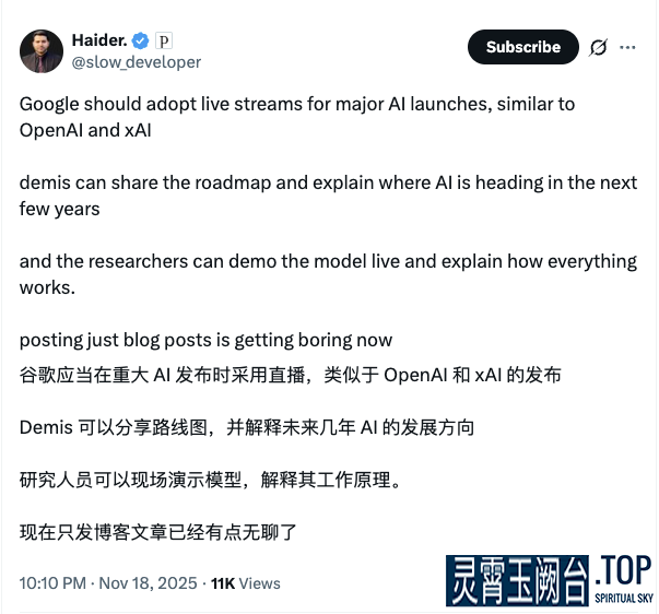 在 X 上,有网友吐槽了谷歌这次模型发布的形式过于枯燥。他认为需要改进的可能并不是模型本身,而是谷歌的发布方式。他评论称:“只有博客文章的发布形式太无聊了。”