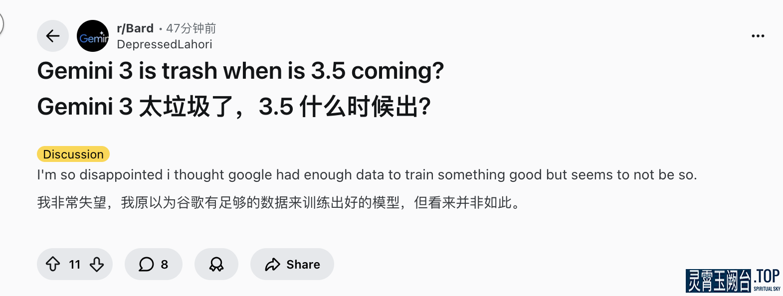 但也有用户对 Gemini 3 表示失望。该网友认为谷歌这次并没有交出很好的答卷。