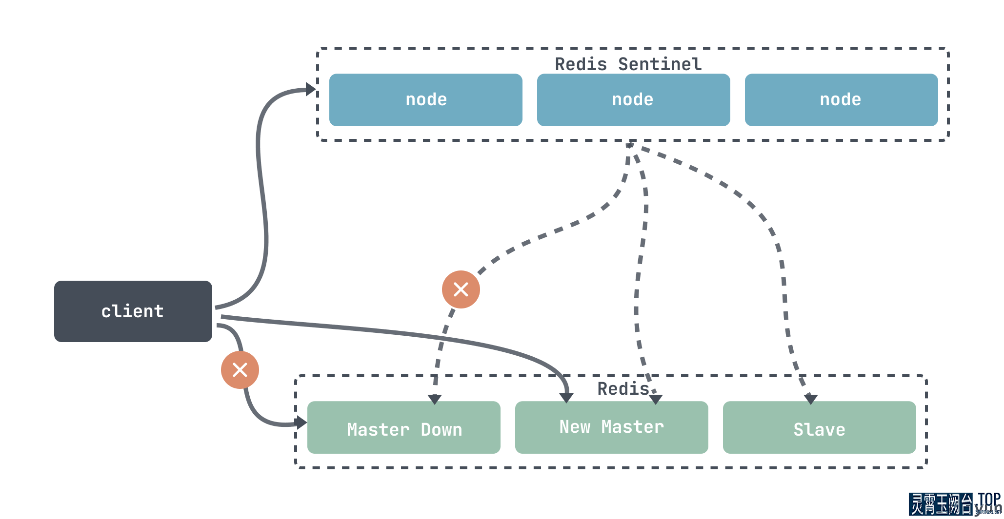我们看看Redis Sentinel 集群是怎么解决这些问题的。Redis Sentinel 负责持续监控主从节点的健康,当主节点挂掉时,自动选择一个最优的从节点切换为主节点。客户端来连接集群时,会首先连接 sentinel,通过 sentinel 来查询主节点的地址,然后再去连接主节点进行数据交互。当主节点发生故障时,客户端会重新向 sentinel 要地址,sentinel 会将最新的主节点地址告诉客户端。