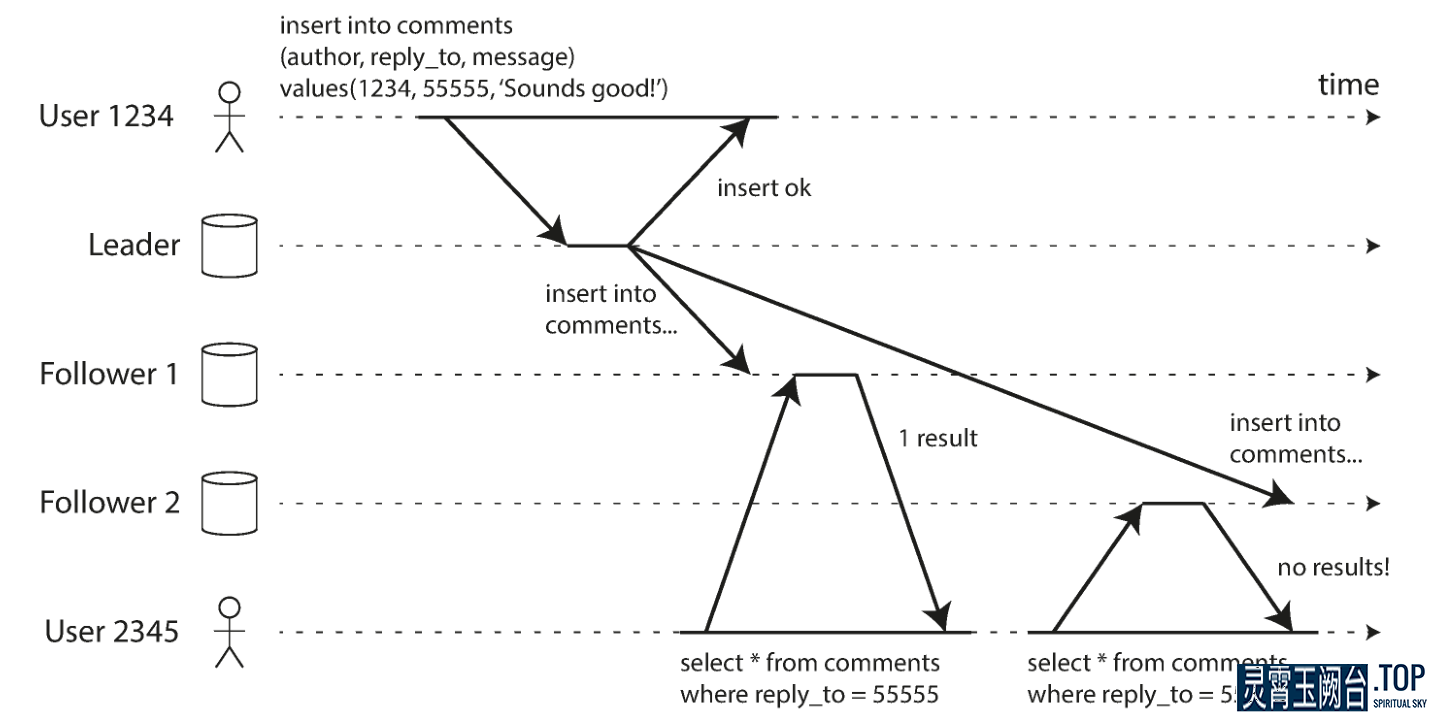 但对于异步复制,如果用户在写入后马上就查看数据,则新数据可能尚未到达副本。对用户而言,看起来好像是刚提交的数据丢失了。
