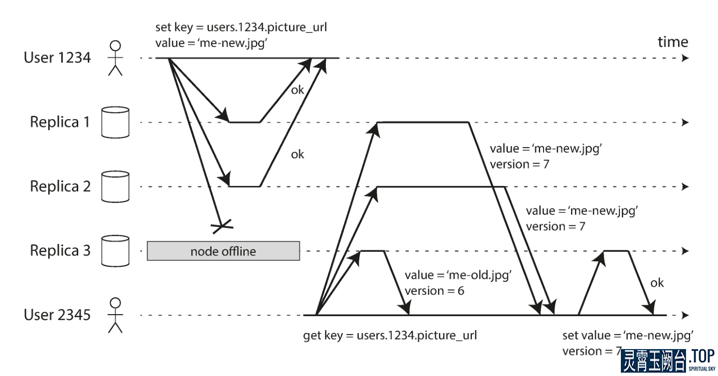 因为有可能会有节点没写入成功,所以当一个客户端从数据库中读取数据时,它不仅仅把它的请求发送到一个副本,而是并行地发送到多个副本。客户可能会从不同的副本获得不同的响应,然后用版本号确定哪个值是更新的。