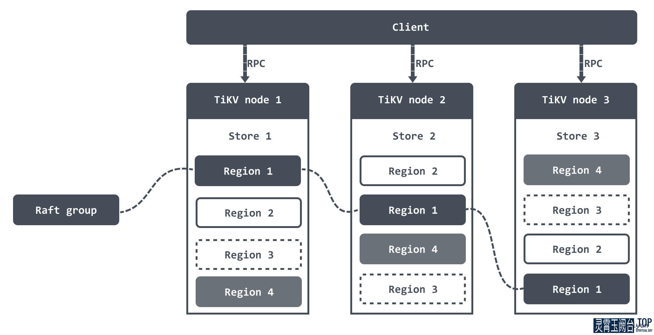 将数据划分成 Region 后,TiKV 会尽量保证每个节点上服务的 Region 数量差不多,并以 Region 为单位做 Raft 的复制和成员管理。也就是如下图,你可以看到不同的 node 节点其实都有一份 Region 的复制。