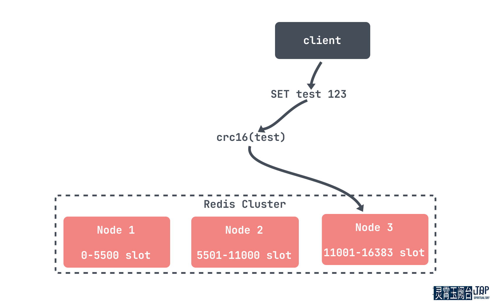 redis cluster 就是采用这种方式,Redis Cluster为整个集群定义了一共 16384 个 slot,slot 就是分区,每个节点负责一部分的 slot。然后 key 会根据 crc16 计算出得结果和 16384 取模进行 slot 定位,从而定位到具体节点。
