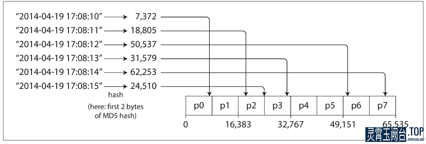 hash 分区就是通过 hash 散列函数,无论何时给定一个新的字符串输入,它将返回一个 0 到 2^32 -1 之间的 “随机” 数。即使输入的字符串非常相似,它们的散列也会均匀分布在这个数字范围内。然后为每个分区分配一个散列范围,每个通过哈希散列落在分区范围内的键将被存储在该分区中。